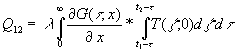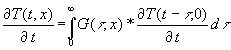 Mit dieser Annahme erscheint ein Integralansatz zweckmäßig (im weiteren Rechengang zeigt sich, daß das tatsächlich weiterführt), der die Randbedingung T(t, 0) mit einer noch zu bestimmenden Funktion G(t , x) faltet, wobei t die Vergangenheit mit der Dimension einer Zeit ist.