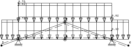 Beim Programm DLT 10 ist die Anzahl der Felder auf 12 begrenzt, d.h. es können maximal 13 Auflager definiert werden. In der Regel werden aber oft mehr Binder vorhanden sein. Deswegen kann die Anzahl der zusätzlichen Auflager nur 13 minus Anzahl der tatsächlichen Auflager sein. Dann sollte man die zusätzlichen Auflager möglichst gleich verteilen und die Federkonstanten geeignet zusammenfassen. Das Zusammenfassen von 2 Federn ergibt z.B. eine doppelt so große Federkonstante. Das Ganze ist ähnlich der Zusammenfassung vieler Binder als Streckenlast statt der Einzelkräfte. Bzw. hier die Federn als Bettung und dann Aufteilung als einzelne zusätzliche Auflager.