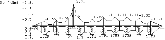 Wie ist jetzt diese Feder bei der Bemessung des Ringbalkens zu berücksichtigen? Z.B. kann der Ringbalken als Einfeldträger oder auch ggf. als Mehrfeldträger bemessen werden. Bei Friedrich und Lochner ist dafür das Programm DLT 10 verwendbar. Dabei ist die z-Richtung die Horizontale (normalerweise ist ja ein Trägerprogramm für vertikale Lasten gedacht und deshalb ist die z-Richtung die Vertikale - Qz, fz. Die horizontale Breite des Balkens ist d, die vertikale Dicke des Balkens ist b). Dabei ergibt sich das Problem, wie die Federn bei der Eingabe zu berücksichtigen sind. Als Kraft ohne Verschiebung ist natürlich H anzusetzen. Wie verringert man nun dies Kraft, wenn der Ringbalken sich verformt, indem er dieser Kraft ausweicht? Direkt ist dafür keine Eingabemöglichkeit vorgesehen - aber man kann mit einer speziellen Eingabe machen. Dazu ergänzt man die tatsächlichen vorhandenen Auflager des Ringbalkens um weitere Auflager (an den Orten der Binderauflager) mit elastischer Stützung. Die Federkonstanten an diesen Stützen werden nun gleich der oben berechneten Federkonstante E gewählt. Wieso bildet das nun die tatsächlichen Verhältnisse richtig nach?